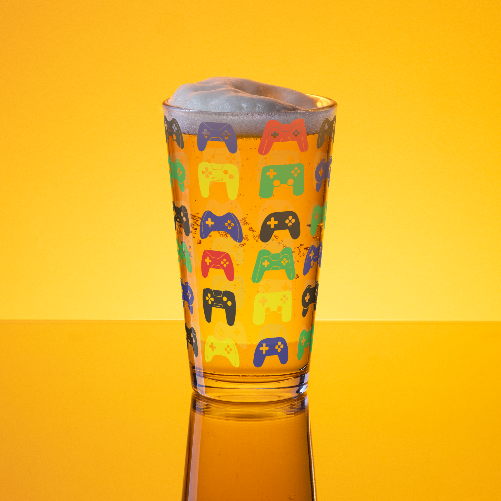 Introducing our high-quality 16oz pint glass, the perfect companion for gamers who appreciate both style and a beverage while gaming. Crafted from premium glass, this pint glass features a unique, eye-catching gaming controller design. Whether toasting a victory or enjoying a drink during your next gaming session, this pint glass delivers a satisfying heft and clarity that enhances every sip. Durable and dishwasher safe, it's designed to withstand the rigors of everyday use while adding a touch of gaming flair to your drinkware collection.