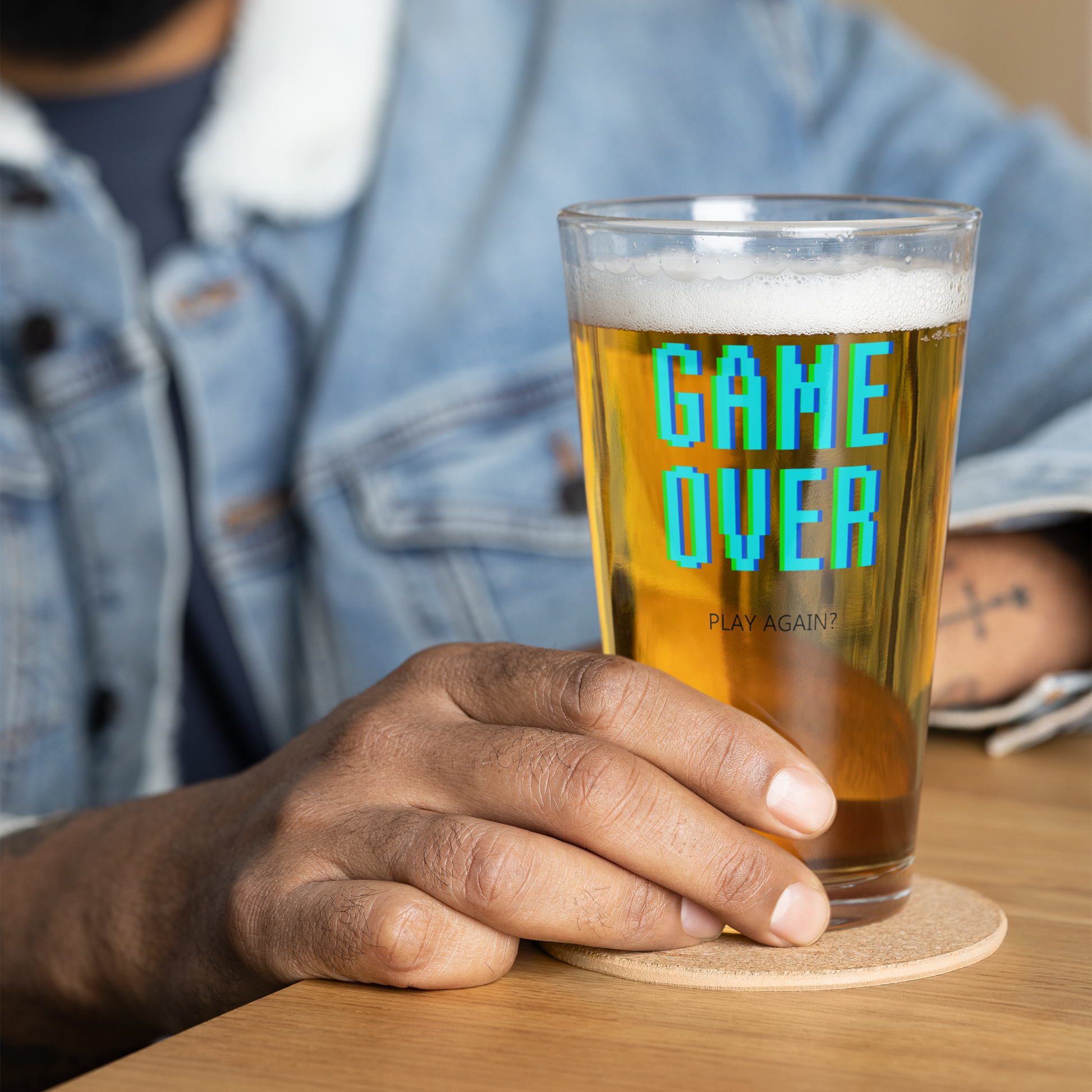 Introducing our high-quality 16oz pint glass, the perfect companion for gamers who appreciate both style and a beverage while gaming. Crafted from premium glass, this pint glass features a unique, eye-catching game over gamer design. Whether toasting a victory or enjoying a drink during your next gaming session, this pint glass delivers a satisfying heft and clarity that enhances every sip. Durable and dishwasher safe, it's designed to withstand the rigors of everyday use while adding a touch of gaming flair to your drinkware collection.