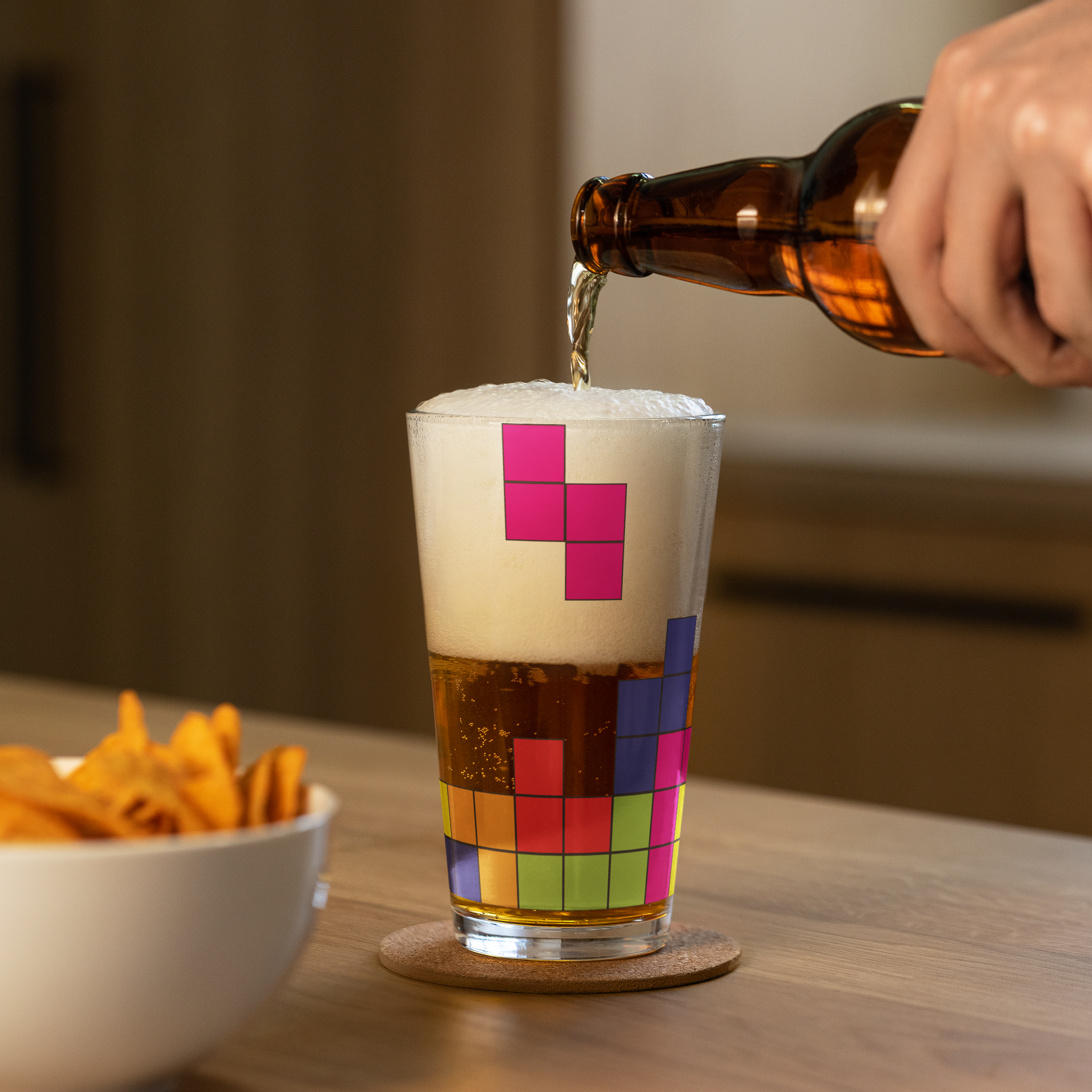 Introducing our high-quality 16oz pint glass, the perfect companion for gamers who appreciate both style and a beverage while gaming. Crafted from premium glass, this pint glass features a unique, eye-catching retro gaming design that pays homage to a gaming classic. Whether toasting a victory or enjoying a drink during your next gaming session, this pint glass delivers a satisfying heft and clarity that enhances every sip. Durable and dishwasher safe, it's designed to withstand the rigors of everyday use while adding a touch of gaming flair to your drinkware collection.